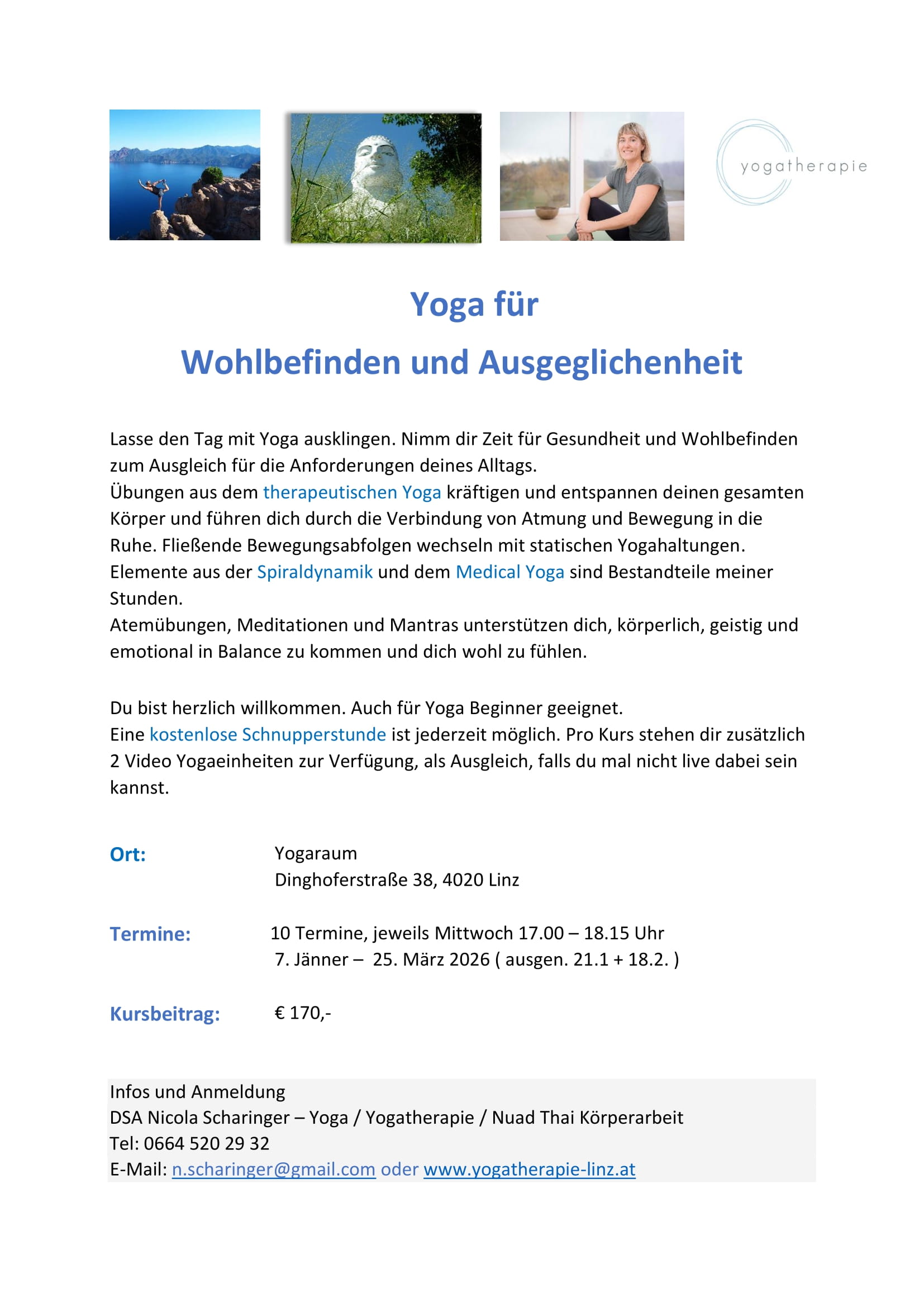 Am Mittwoch 7.Jänner startet der nächste Yogakurs in Linz. Eine gute Gelegenheit das neue Jahr mit Gesundheit und Bewegung zu beginnen.